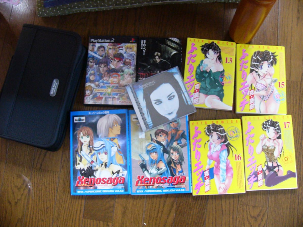 まず96枚収納のDVD・CDケース、ナムカプ、小説バイオ3、ふたりエッチ13・14・16・17巻、ゼノ同人誌2冊、そしてエヴァネッセンスのフォールン。