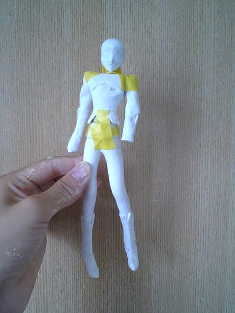 身体にはエポパテが入っている為周りを切って土台を作ることが難しいので、クラフトテープを巻いてその上からファンドをつけ前後分割の薄い土台を作りました。