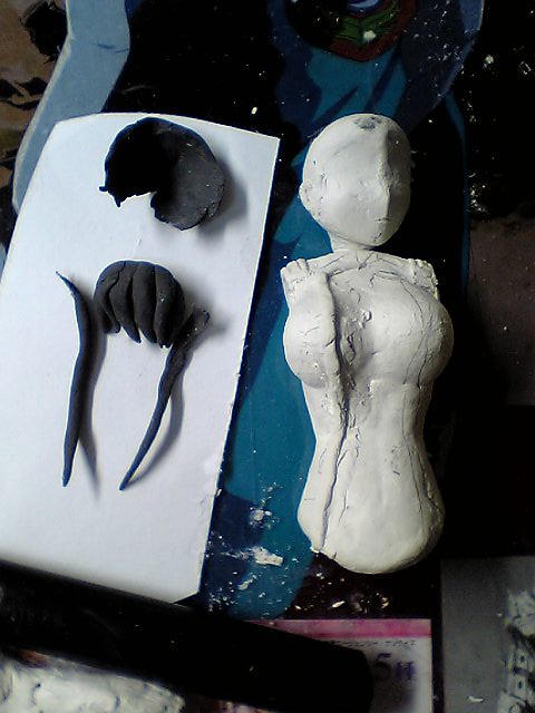 左の黒いのは絵の具で色付けて適当に作った髪の毛です。